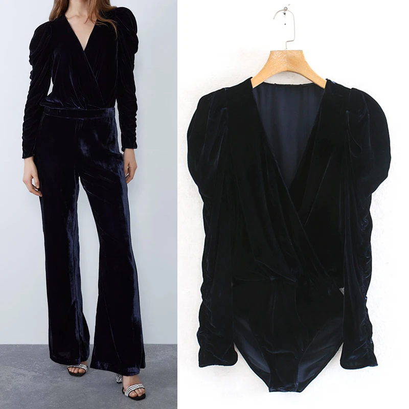 2020 Za New Casual Fashion Lady Female Women Women's clothes Velvet material V-neck Long sleeve bod